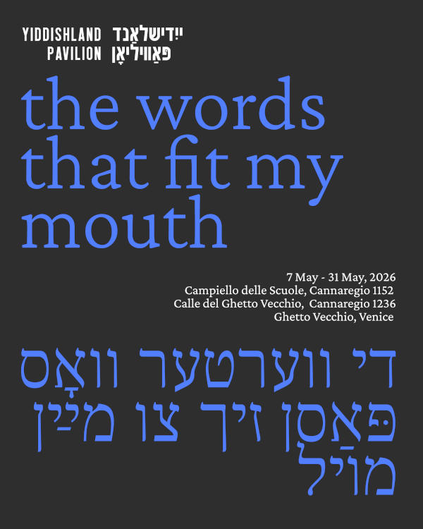 The New York-based artist Yevgeniy Fiks is happy to announce on our website the third edition of the Yiddishland Pavilion at the Venice Biennale. The opening ceremomy will take place on May 7 from 6 till 8 PM. This year’s edition is titled The Words That Fit My Mouth. The full program is available on the pavilion’s website.